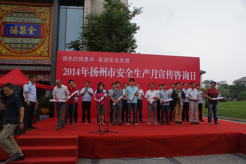 6月16日上午,揚(yáng)州市安委辦會同蜀崗—瘦西湖風(fēng)景名勝區(qū)管委會在虹橋坊舉行了以“強(qiáng)化紅線意識,促進(jìn)安全發(fā)展”為主題的2014年揚(yáng)州市“安全生產(chǎn)月”宣傳咨詢?nèi)栈顒印J邪参瘯、市安監(jiān)局、蜀岡—瘦西湖風(fēng)景名勝區(qū)管委會、市人保公司負(fù)責(zé)人出席了活動。市安監(jiān)局、揚(yáng)汽集團(tuán)、市城建控股集團(tuán)、市工藝美術(shù)集團(tuán)、金茂化工集團(tuán)、揚(yáng)子江集團(tuán)、建工控股集團(tuán)等11家單位以及消防、建筑、燃?xì)狻庀、質(zhì)監(jiān)、部分駐揚(yáng)單位的職工代表共計400余人參加了活動。