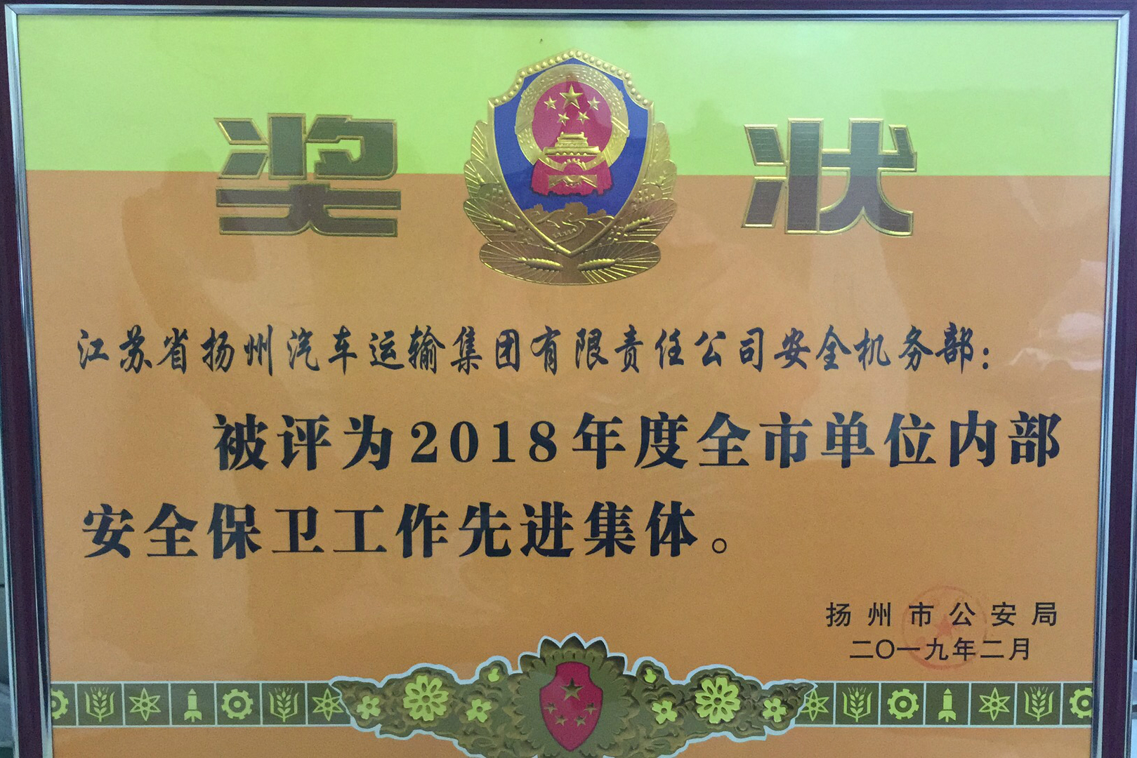 近日,揚汽集團獲揚州市公安局表彰,集團安全機務(wù)部被評為2018年度全市單位內(nèi)部安全保衛(wèi)工作先進集體,馬繼賢被評為2018年度全市單位內(nèi)部安全保衛(wèi)工作先進個人。