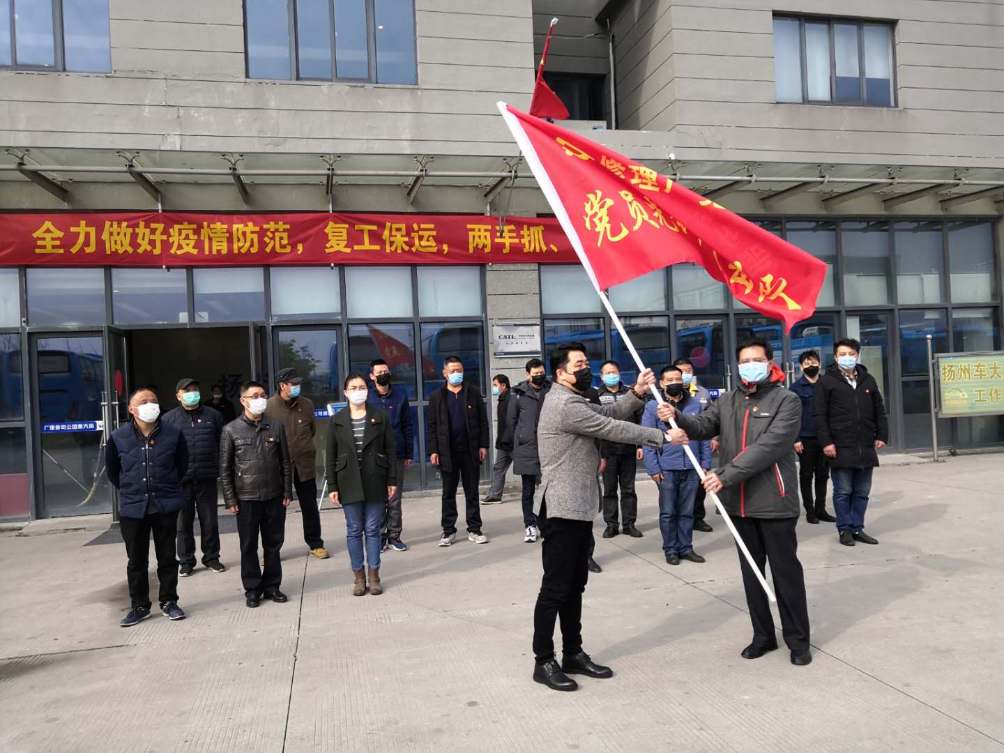 2月24日,揚(yáng)汽班線復(fù)運(yùn)首日,揚(yáng)汽集團(tuán)修理廠黨支部黨員先鋒突擊隊(duì)成立大會(huì)在修理廠召開(kāi)。二十多名黨員組成的先鋒突擊隊(duì),分成疫情防控、復(fù)工保運(yùn)、志愿服務(wù)三個(gè)小組,一把手廠長(zhǎng)親自擔(dān)任隊(duì)長(zhǎng),書(shū)記、干部、勞模分別擔(dān)任組長(zhǎng),并將工作任務(wù)分解成九個(gè)大項(xiàng),明確責(zé)任人,統(tǒng)籌安排好恢復(fù)生產(chǎn)的各項(xiàng)工作。在困難面前,充分體現(xiàn)出了共產(chǎn)黨員的責(zé)任與擔(dān)當(dāng)。集團(tuán)黨委副書(shū)記顧懷代表集團(tuán)黨委為修理廠黨員先鋒突擊隊(duì)授旗,鼓勵(lì)他們?cè)陉P(guān)鍵時(shí)刻能夠挺身而出,發(fā)揮黨員自身的先鋒模范作用,為揚(yáng)汽集團(tuán)在疫情期間的復(fù)工保運(yùn)工作作出積極貢獻(xiàn)。